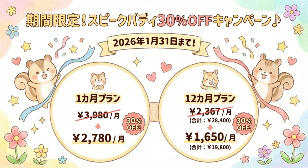 現在スピークバディでは、通常の料金プランに対して、2026年1月31日まで30%OFFのキャンペーンを実施!!